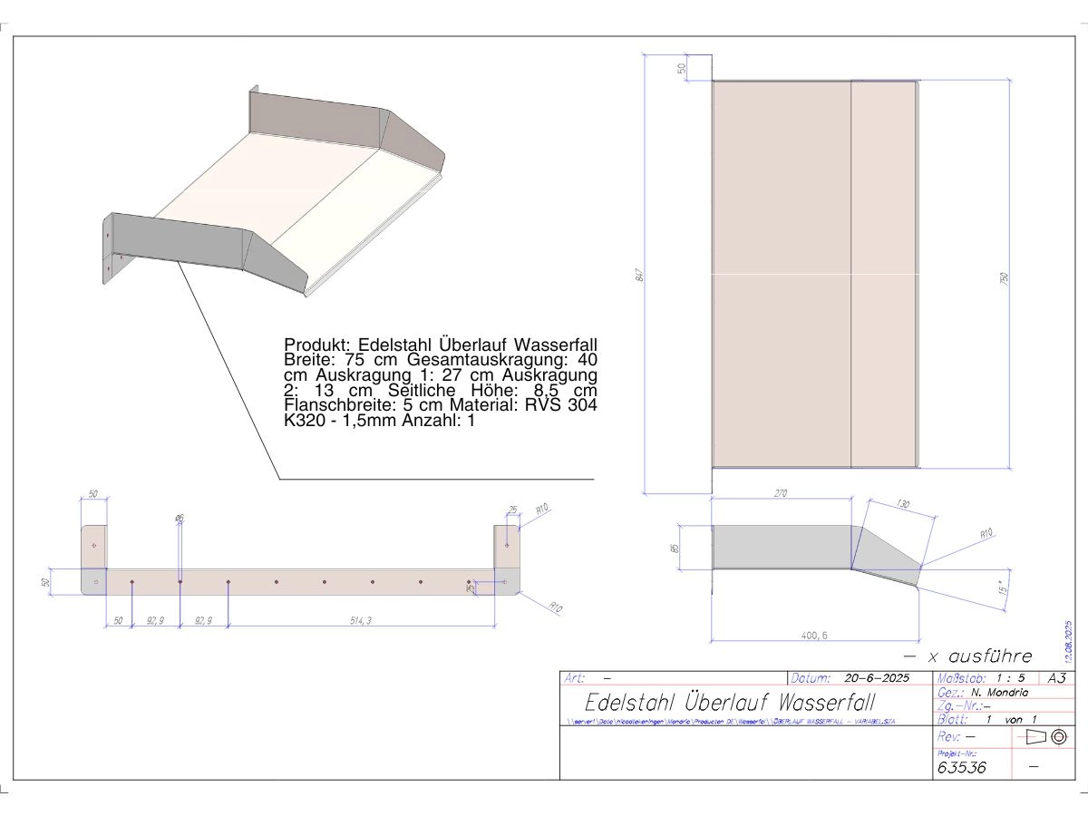 Technische Details und Maße Ihres Edelstahl-Überlaufwasserfalls