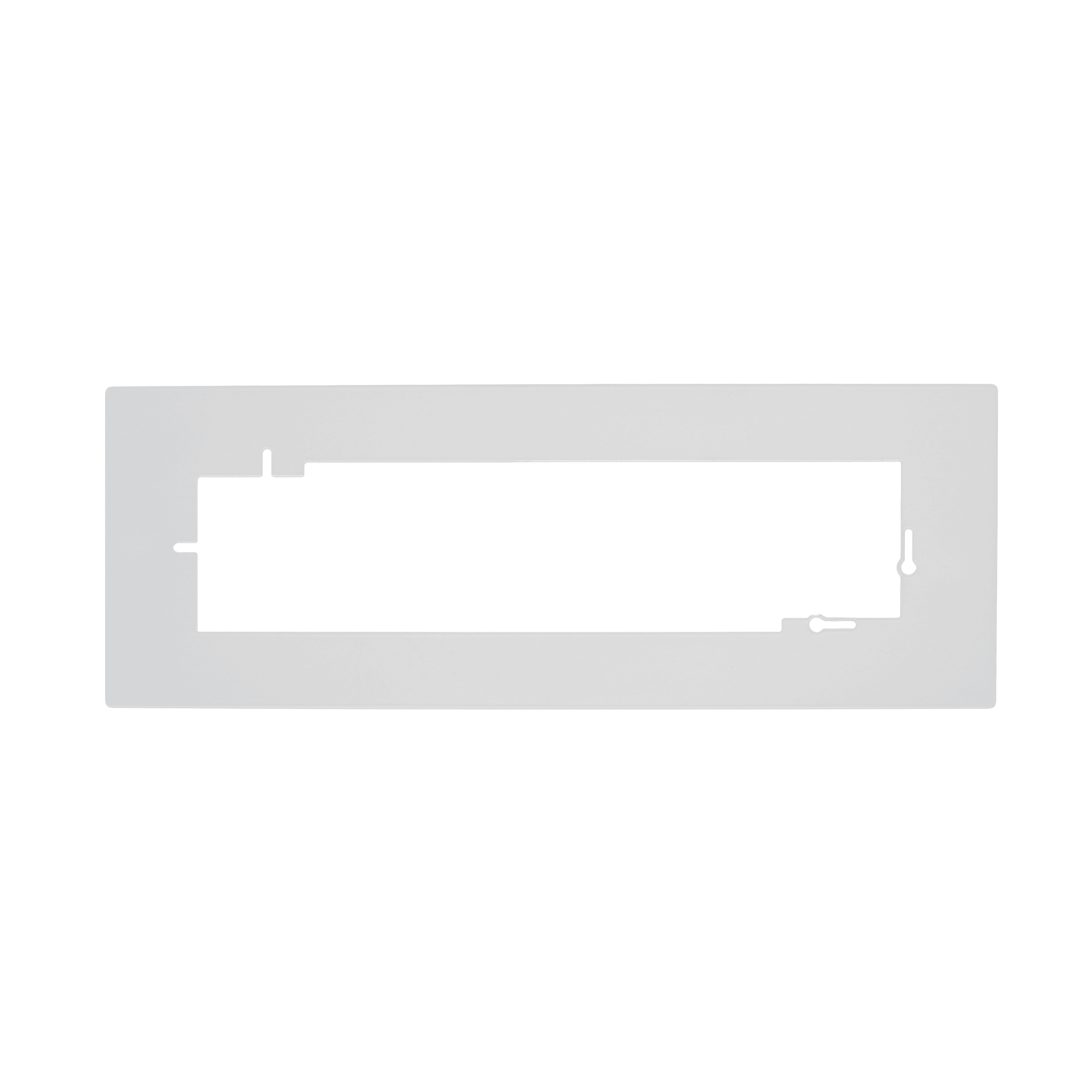 Schieben Sie die Weiß Abdeckplatte (Weiß matt (RAL 9010)) vorsichtig unter die Schrauben. Ziehen Sie zunächst die horizontale Schraube fest und richten Sie die Platte waagerecht aus. Befestigen Sie anschließend die vertikale Schraube, um die Platte sicher zu fixieren.